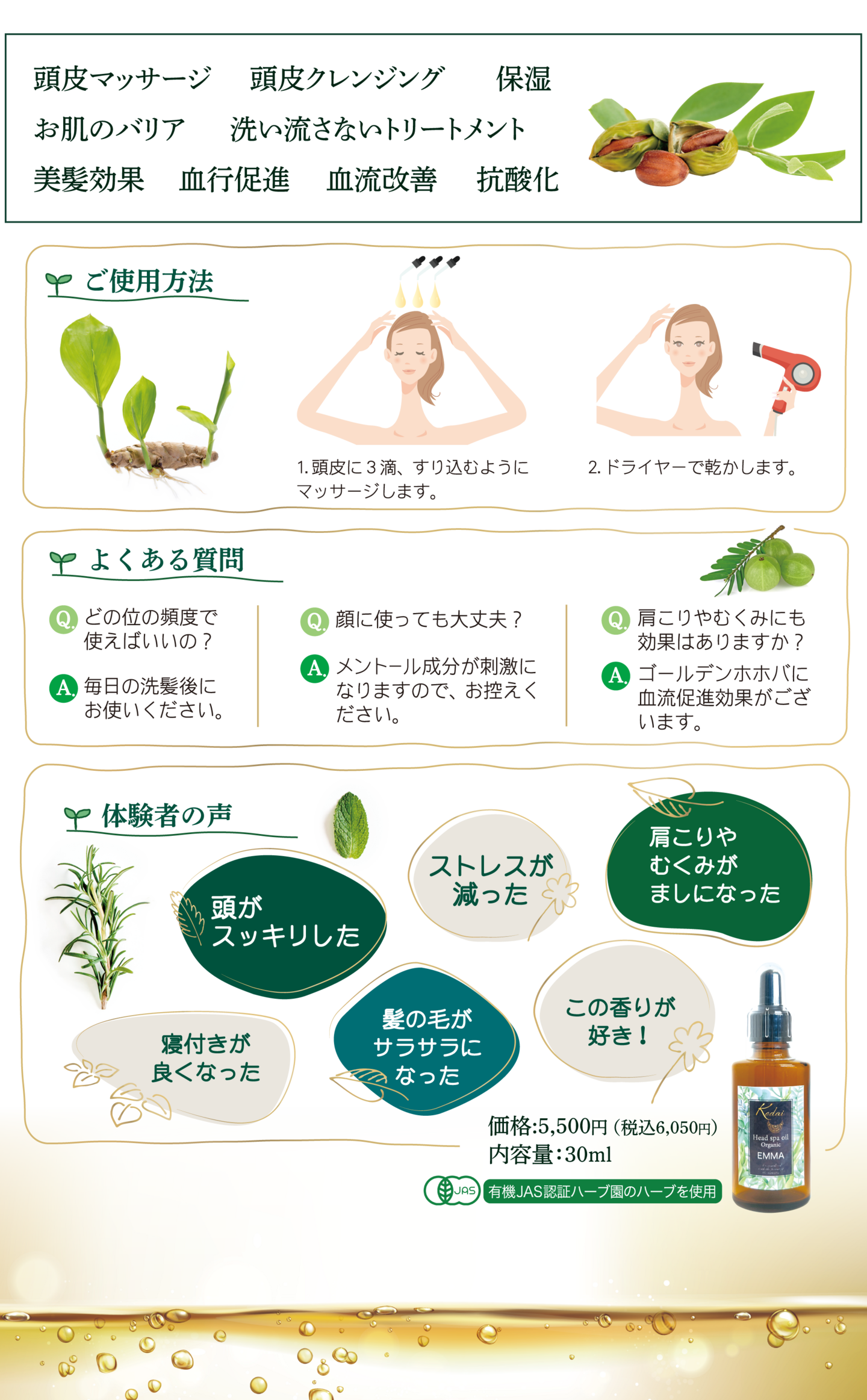 頭皮マッサージ・頭皮クレンジング・保湿・お肌のバリア・洗い流さないトリートメント・美髪効果・血行促進・血流改善・抗酸化などにお使い頂けます。