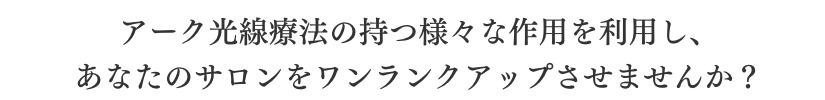 最先端の医学で注目されている「光療法」 。近年、光が人体に深く関与していることが次々と明らかになり、数多くの治療に応用され、医療の現場では治療に活躍しています。アーク光線療法は、この原理を用い、最新のコンピューターで制御する厚生労働省認可の光線治療器を使用した複合光線治療法です。詳しくはこちら