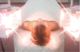 専用のドームベット内で、4台~5台の光線治療器で、40分~60分の連続照射を行う療法です。 ・光の作用と合わせて、深部温熱作用が著しく高まるため、通常では発汗しにくい「皮脂腺からの発汗」を促しますので、デトックス効果が同時に得られます。