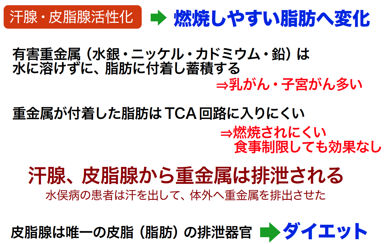 汗はほとんどが水です。赤血球も血液という水分で運ばれるが、水には表面張力で、大きな粒になりたがる。(これがどろどろ血液)これを、遠赤外線の共鳴振動の作用で水の粒をゆすって、大粒になるのを防ぐ。血流改善で、体温が上がる(温熱効果)と、体内酵素が活性化される。⇒免疫力が上がる。