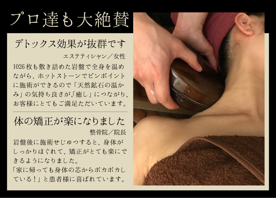 ホットストーン ホットストーンで温まった後のマッサージは体の痛みが軽減されて、スッキリ感が違う! |